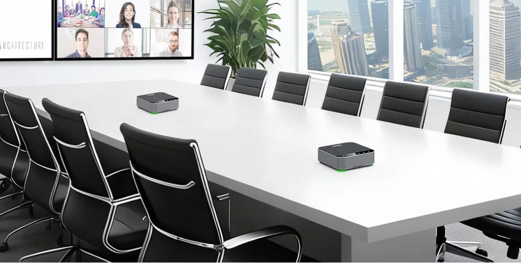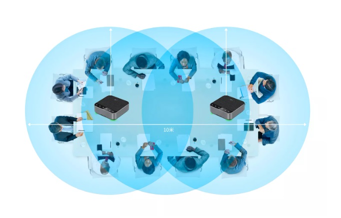 Поддержка беспроводного каскадирования двух спикерфонов позволяет увеличить зону охвата до 50 кв м, что позволяет использовать спикерфоны в больших переговорных и конференц-комнатах, как для проведения аудиконференций, так и в составе AV-комплектов для видеоконференций.