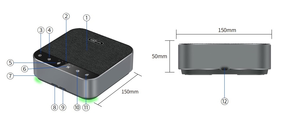 Размеры спикерфона: 150 x 150 x 50 мм